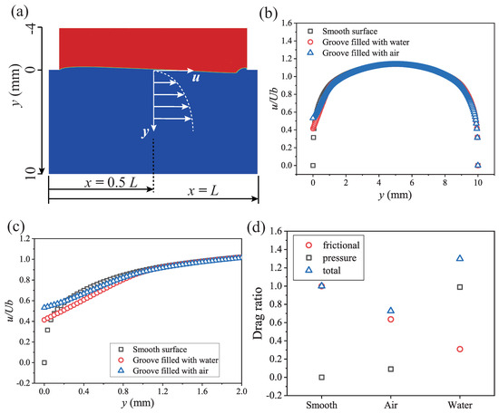 The velocity profile along the y-axis of the smooth surface, groove filled with water and groove filled with air is presented in Figure 7b,c. For the smooth surface, the velocity is 0 at . For the groove filled with water or air, the velocity is greater than 0 at y = 0, which means the slip velocity is caused by the vortex (Figure 6). The slip velocity leads to the intensified friction coefficient on the top of the groove (Figure 6). The velocity gradient of the smooth surface is the largest among these three samples, which means that the smooth surface experiences large frictional drag. The velocity gradient of the groove filled with air is the smallest among these three samples. The velocity gradient of the groove filled with water is smaller than the smooth surface and is larger than the groove filled with air. This indicates that the existence of a vortex in the groove can reduce the frictional drag.