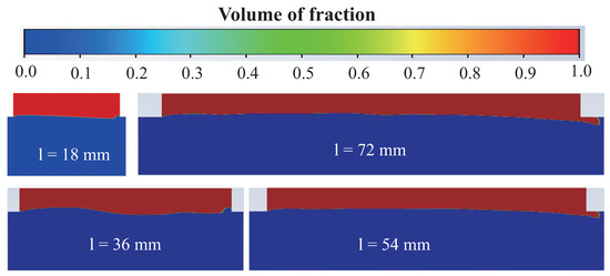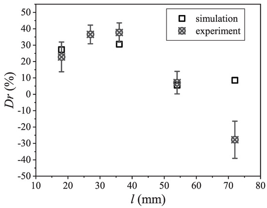 In Figure 12, the drag reduction rate varying with the groove length is presented. The is 22.8% for the groove length of 18 mm. The increases to 36.5% and 37.7% at the groove length of 27 mm and 36 mm, respectively. The starts to decrease when the groove length exceeds 36 mm. The is 7.1% for the groove length of 54 mm. The is −27.7% for the groove length of 72 mm, which means drag increase. The result shows that the discrete grooves exhibit drag reduction when the is 100% and exhibit drag increase when the is less than 100%. The maximum drag reduction rate of 37.7% is obtained at the groove length of 36 mm. This is consistent with the existing works that the drag reduction rate is related to the trapped air coverage rate [8,11,12]. The result of the simulation is also presented in Figure 12. The result shows that the simulation result is within the experimental error range except for the groove with a length of 72 mm. The exception is caused by the trapped air escape. In the experiment, the trapped air escapes from grooves, and the grooves are wetted (Figure 11). However, in the numerical simulation, the simulated time is short and the air escape is not found (Figure 8). Thus, the numerical result shows drag reduction while the experimental result shows drag increase. The result confirms the numerical simulation and the experimental measurements. For the less than 100%, the trapped air is squeezed out from the grooves by the water and the wetted grooves introduce extra pressure drag. Thus, the drag increase is produced at the less than 100%.