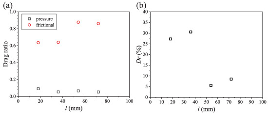 The drag ratio (a) and drag reduction rate (b) varying with the groove length l.