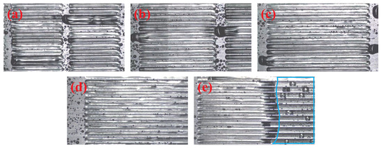 In Figure 11, the trapped air stability in the grooves with different lengths is presented. The trapped air is intact when the groove length l is less than 54 mm (Figure 11a–d). The grooves are wetted when the groove length l is greater than 72 mm (Figure 11e). The result indicates that the grooves with lengths less than 72 mm can successfully avoid the air escape at the Reynolds number = 2500. It can also be found that air beads hang at the trailing edge of the grooves for the groove lengths of 18 mm and 27 mm and 36 mm (Figure 11a–c). This indicates that the frictional force caused by the flowing water is limited and the capillary force provided by the TPCL is abundant and supports the hanging air beads. The air beads disappear when the groove length increases to 54 mm. This means that the frictional force caused by the flowing water reaches the maximum capillary force and the air beads can no longer hang at the trailing edge of the grooves. The experimental result confirms our analysis that the discrete grooves with limited length can successfully avoid air escape.