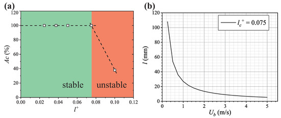 The is 100% for the intact trapped air. For the dimensionless groove length of 0.1 (72 mm), the is 37.9%. We regard the trapped air in the grooves with length ( 54 mm) as a stable state and the trapped air in the grooves with length ( 54 mm) as an unstable state. That means = 0.075. By employing the Equations (18) and (20), the threshold of the groove length at different velocity is obtained and is plotted in Figure 13b. For groove lengths shorter than this threshold, the trapped air is stable. For groove lengths longer than this threshold, the trapped air might be unstable and escape from the grooves. The threshold of the groove length is 54 mm, 27 mm, 13.5 mm, and 5.4 mm at the velocity of 0.5 m/s, 1.0 m/s, 2.0 m/s and 5.0 m/s, respectively.