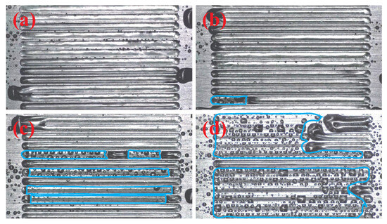 The trapped air stability in the grooves. The groove depth are 4 mm (a), 2 mm (b), 1 mm (c), and 0.5 mm (d). Grooves wetted by water are circled with a blue line.