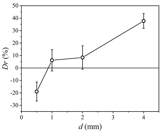 In Figure 18, the drag reduction rate varying with the groove depth is presented. The is 37.8% when the groove depth is 4 mm. The is 8.4% when the groove depth is 2 mm. The is 6.1% when the groove depth is 1 mm. The is −19.0% when the groove depth is 0.5 mm. As is illustrated in Section 3.3.3, the wetted grooves introduce pressure drag and cause drag increase. Thus, the drag reduction rate decreases when the wetted grooves increase.
