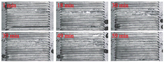 In order to verify that the deepened grooves can mitigate the air dissolution, the grooves with a depth of 4 mm are chosen and tested under the flowing water for 60 min. The result is presented in Figure 19. The result shows that the trapped air is intact and no obvious dissolution is found in the optical pictures. This result confirms that the air dissolution is negligible for the grooves with a depth of 4 mm and is successfully mitigated.