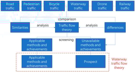 As shown in Figure 1, this research aims to summarize the characteristics of waterway traffic by comparing the similarities and differences among several typical traffic modes. Based on these characteristics, it analyzes and discusses the theoretical research findings and methodologies related to traffic flow. The main achievements and key limitations of these approaches are outlined, and their applicability to waterway traffic is evaluated.