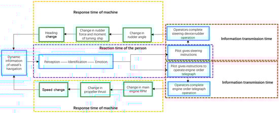 In contrast, as shown in Figure 3, the collision-avoidance decision-making process in waterway traffic often involves multiple operators (pilot, captain, helmsman, etc.) and several stages. As a result, the overall reaction time comprises the operators’ perception–response times, the machine’s response time, and the information transfer time. Additionally, the mechanical systems of cars, bicycles, trains, drones, and airplanes are highly responsive, making their mechanical response times almost negligible compared to their operator’s perception–reaction time. Conversely, the mechanical systems of vessels are larger and more complex, resulting in longer response times that cannot be ignored.