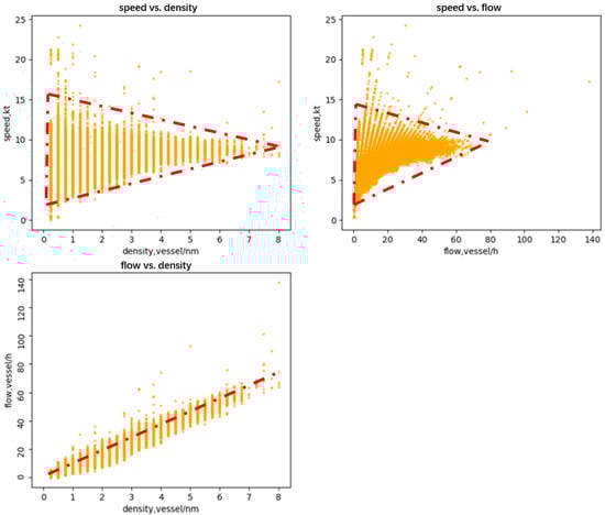 Recent research using waterway traffic data has revealed a different pattern in the fundamental diagram than that using roadway traffic data [20,31,68]. Fundamental diagrams of waterway traffic flow usually also contain three sub-diagrams, which are used to describe the relationship between speed, density, and flow, respectively. The speed, density, and flow data are calculated based on the collected traffic flow data. For instance, the fundamental diagram of waterway traffic shown in Figure 6 shows data points clustered primarily in the free-flow region, with few, if any, points in the congested area. This raises the question of whether a fundamental diagram exists for waterway traffic. If it does, is this difference due to the way fundamental diagrams are presented, or is the traffic pattern genuinely different across types? Answering this question is crucial before formulating a theory for waterway traffic flow. Additionally, observing Figure 6 reveals that the speed–density and speed–flow relationships exhibit a triangular shape. This contrasts sharply with the results shown in the fundamental diagram of roadway traffic flow. The reasons behind this discrepancy warrant further exploration.