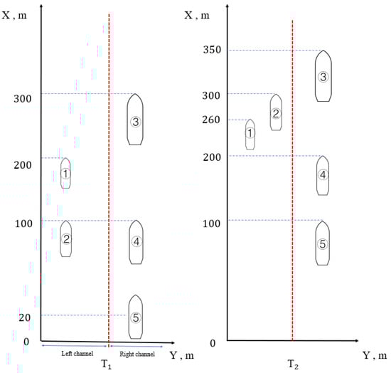 Based on the spatial and temporal movement trajectories of vessels, traffic flow characteristics can be calculated using Equations (1)–(3) to evaluate the aforementioned conjecture, assuming the total length of the channel is l nautical mile and the total width is 1 nautical mile, with a time interval of 1 min. Figure 7 illustrates the vessel spatial and temporal movement trajectory points. By observing the positions of the vessels (labeled 1–5) at two different times (T1 and T2) in the left channel, right channel, and pre-subdivided channel, the traffic flow characteristics can be determined both with and without channel subdivision. The results of these calculations are presented in Table 6.