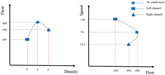 As shown in Figure 8, The right channel exhibits the highest density, while the left channel has the lowest. The pre-subdivided channel shows the highest flow, followed by the right channel, with the left channel exhibiting the lowest flow. The computed traffic flow characteristics before and after channel subdivision reveal notable discrepancies: the density in the right channel exceeds that of the pre-subdivided channel, while its flow is lower. This trend indicates a decrease in flow alongside an increase in density, which aligns with the characteristics of congested flow. Therefore, differences in the current fundamental diagrams of road traffic and waterway traffic flows may be influenced by the way their fundamental diagrams are presented. This method shows promise for identifying ship traffic flow data in congested areas.