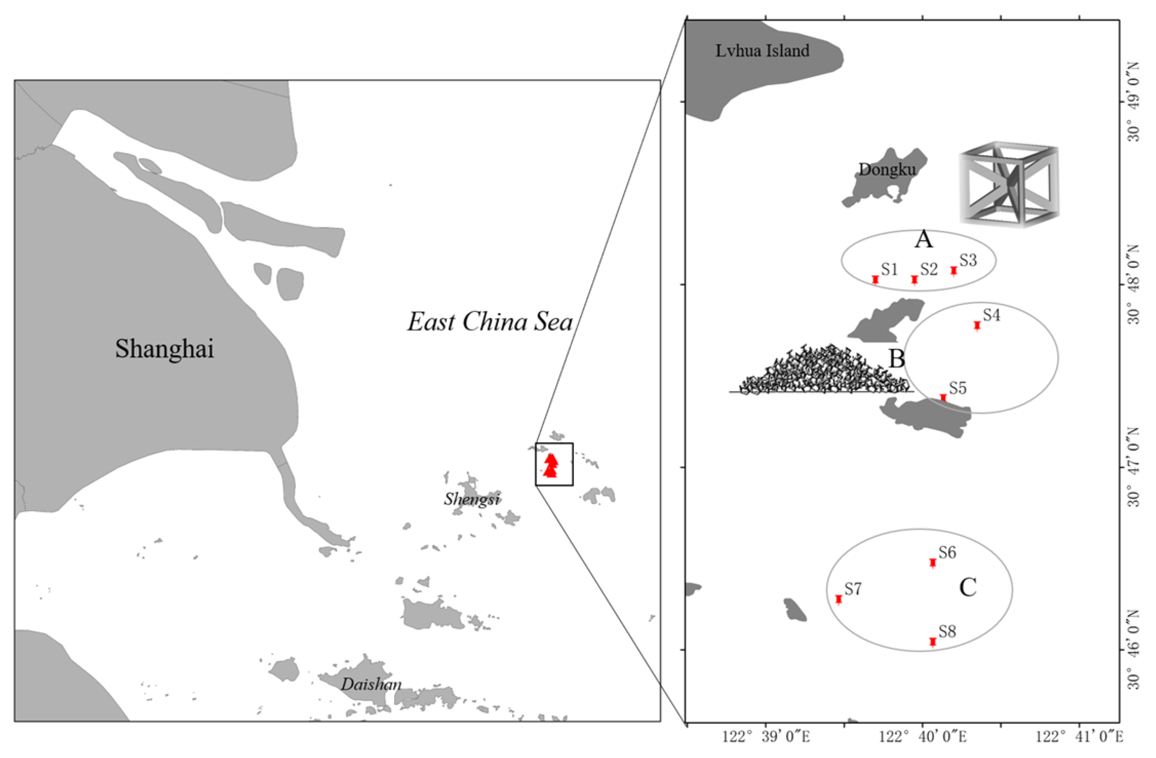 - Wang, Z.; Zhang, S.; Wang, K. Fish and macroinvertebrates community structure in artificial habitat around Sanheng Island, Shengsi, China. Acta Ecol. Sin. 2010, 30, 2026–2935. [Google Scholar]