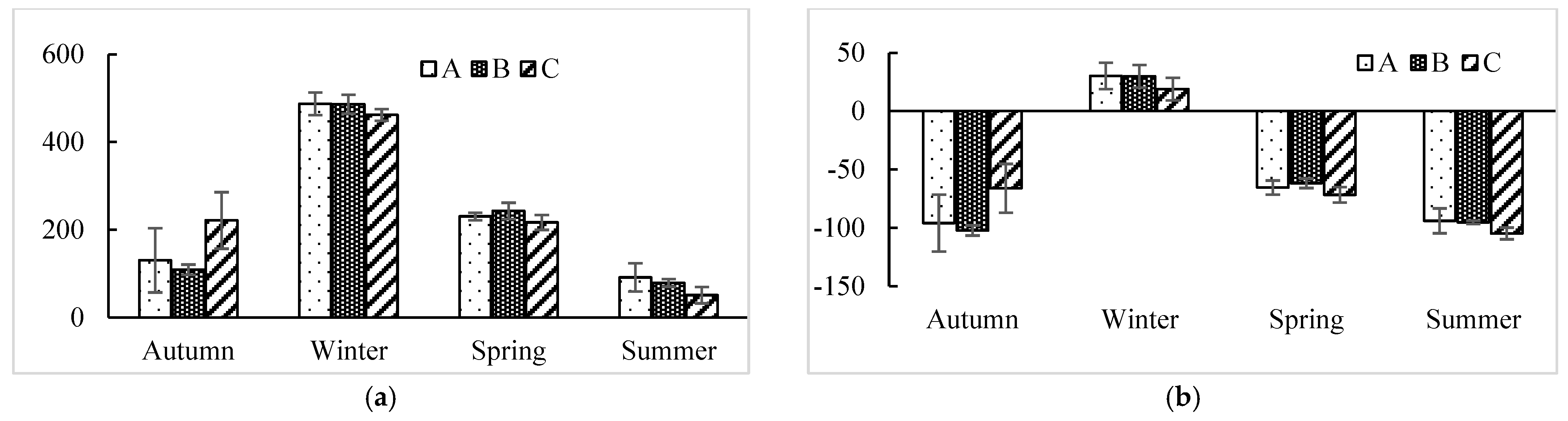 | FCO2 | Total area | −86.3 ± 21.99 | 25.89 ± 9.62 | −66.86 ± 6.59 | −98.61 ± 8.22 |