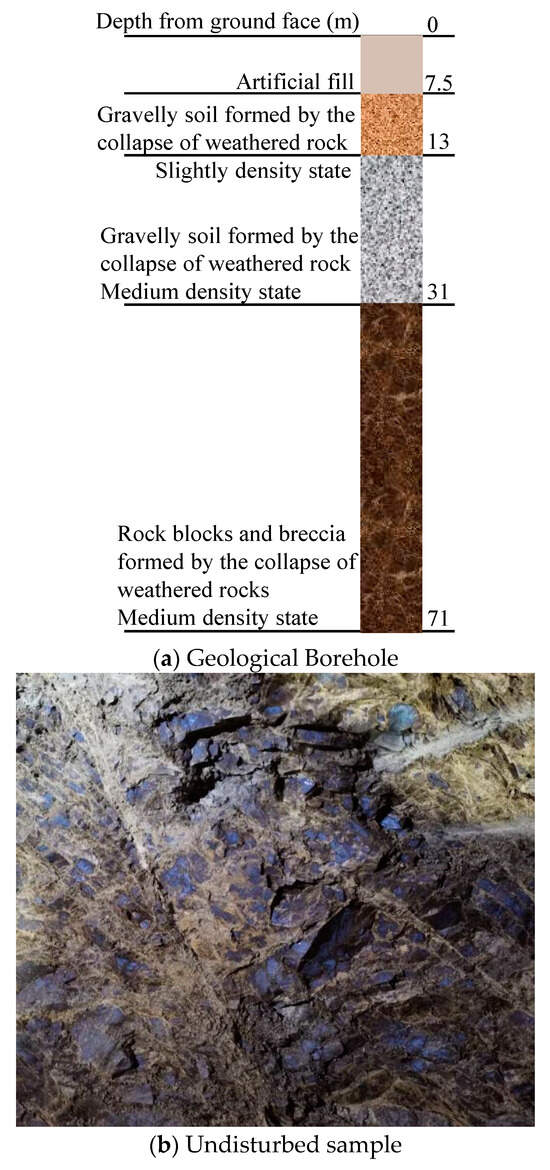 The experimental site is located on a slope along the Jinsha River in the Kahaluo Township, Sichuan Province, China, characterized by a thick overburden layer. Geological surveys reveal that the experimental closed wall is situated in Upper Pleistocene collapse slope alluvium, consisting primarily of block stones, gravel, and breccia. The stone is mainly composed of strongly to moderately weathered mudstone. The deep collapse body experiences minimal weathering and geological movement, resulting in dense boulders, while the upper to middle portions are more weathered, degrading into gravel. The breccia is mainly derived from interlayer fractures within the collapsed strata.