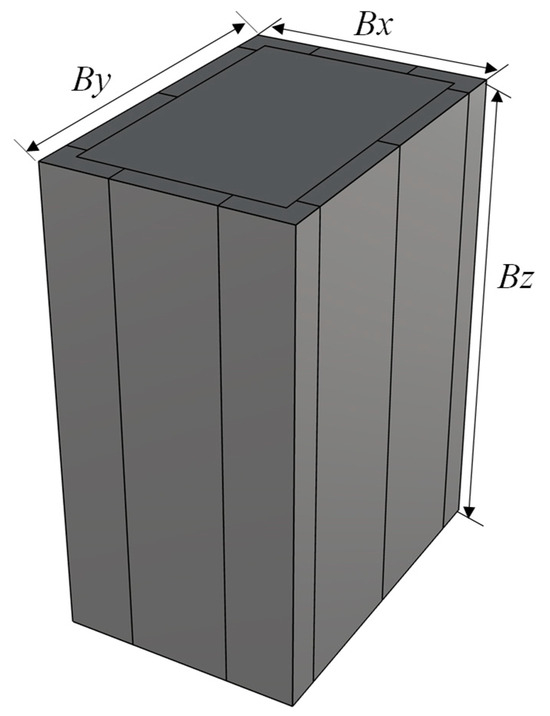 A closed-diaphragm wall is constructed using the diaphragm wall construction technique. Upon completion of construction, the internal soil core is preserved, and a rigid top slab is placed on top to form an integrated structure. As illustrated in Figure 2, the closed-diaphragm wall foundation has the following dimensions: Bx is 11.8 m, By is 18 m, and Bz is 26 m, with a wall thickness of 1.2 m. The closed wall is formed by L-shaped diaphragm walls at each of the four corners, a rectangular cross-section diaphragm wall along the Bx side, and two rectangular cross-section diaphragm walls along the By side. Adjacent diaphragm walls are connected using rigid joints to form a closed-diaphragm wall foundation.