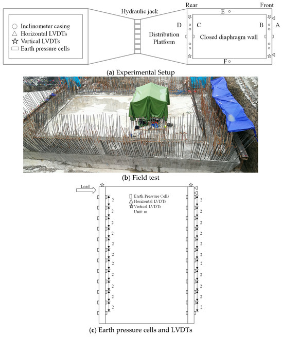 As shown in Figure 3a,c, Linear Variable Differential Transformers (LVDTs) were installed on the top of the diaphragm wall to monitor the displacement variations during the test. The LVDTs for monitoring horizontal displacements were spaced 1 m apart.