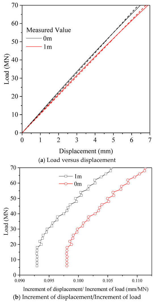 This experiment followed the Chinese standard JTG/T 3512-2020 [19], using a slow-loading and maintained-load method, with the final load reaching 70 MN. The initial load was 4 MN, increasing in increments of 2 MN over 34 stages. This method is similar to ASTM D1143-81, both specifying the use of maintained constant load, implemented through a series of equal load increments, and ensuring that each load level is maintained for a period of time.