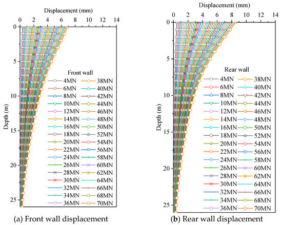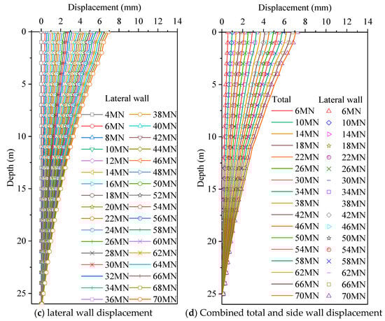 Figure 5 illustrates the displacement variation of the closed wall along its depth under a horizontal load. The top of the closed-diaphragm wall experiences the greatest displacement, which gradually decreases with depth and shows a slight overall bend. Specifically, at the front wall and rear wall, the displacement of the diaphragm wall does not decrease to zero near the foundation bottom, whereas at the lateral walls, the displacement approaches zero near the foundation bottom. The difference in displacement variation with depth at various positions is that the nonlinearity of displacement variation with depth at the front wall and rear wall is more pronounced than at the lateral walls. This is because the local cross-sectional bending stiffness of the diaphragm wall at the front wall and rear wall is smaller than at the lateral walls, resulting in a higher susceptibility to deformation under a horizontal load.
