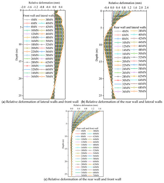 Figure 6 illustrates the pattern of relative deformation with depth at various positions of the closed-diaphragm wall. Specifically, the maximum relative deformation of the lateral and front walls is approximately 0.4 mm, and it is approximately 1.2 mm between the rear wall and lateral walls and approximately 1.6 mm between the rear wall and the front wall. The maximum relative deformation of different sections of the closed wall is only 0.13% of the wall thickness, and the relative deformation is much smaller than the smallest dimension of the closed-diaphragm wall. Therefore, it can be concluded that the deformations of all parts of the closed-diaphragm wall are synchronous, allowing it to be treated as a rigid body model for force analysis. This conclusion is consistent with the assumption of the closed-diaphragm wall foundation as a rigid body, as proposed by Kaino [1].