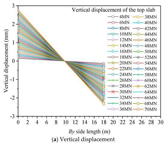 Figure 7a shows the vertical displacement at the top slab of the closed wall, where positive values represent upward vertical displacement and negative values represent downward vertical displacement. Under a horizontal load, the vertical displacement at the top slab of the closed wall is upward at the location’s rear wall and downward at the location’s front wall. This behavior is consistent with the vertical displacement variation under a horizontal load, as described by Cheng [20].