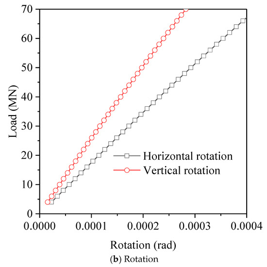 The horizontal and vertical rotation angles at the top slab of the closed wall are shown in Figure 7b. Under the same load, the horizontal rotation angle is greater than the vertical rotation angle. As the load increases, the difference between them gradually becomes more pronounced, indicating that under a horizontal load, the closed wall primarily exhibits horizontal displacement.