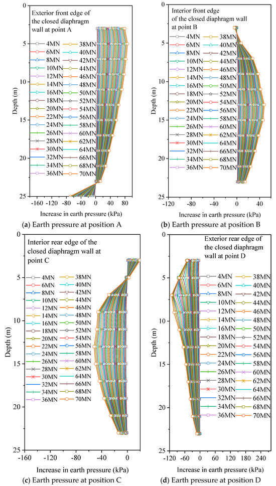 As illustrated in Figure 8d, the earth pressure at point D, located on the external side of the closed-diaphragm wall, shows a negative increment, indicating that earth pressure decreases as the load increases. The trend of changes in earth pressure is divided into two sections: in the upper section, as the depth increases, the decrease in earth pressure becomes more pronounced; in the lower section, as the depth increases, the decrease in earth pressure becomes less pronounced. The turning point under the maximum load occurs at a depth of about 7 m.