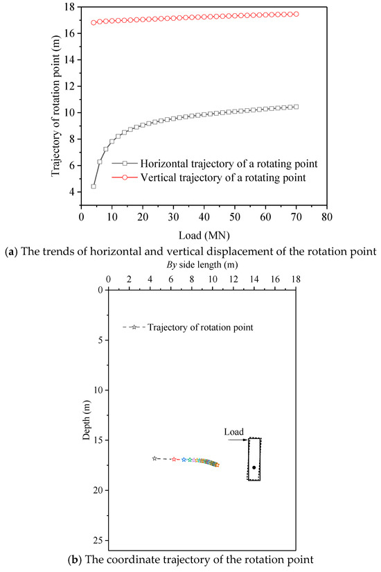 The vertical and horizontal displacements at the top of the closed wall are used to determine the motion trajectory of its rotation point through geometric relationships, as illustrated in Figure 9a. The trajectory of the rotation point shows minor variation along the vertical axis (Bz: depth range), changing from 16.8 m to 17.5 m, with the vertical variation range being 0.67 Bz to 0.7 Bz. Along the horizontal axis (By: length range), it varies significantly from 4.4 m to 10.5 m, with the horizontal variation ranging from 0.24 By to 0.58 By. This indicates that the rotation point’s position is greatly influenced by horizontal displacement, and the displacement of the closed wall is primarily horizontal. This observation is consistent with the analysis of the top angle of the foundation (Figure 6b). As the load increases, the horizontal movement of the rotation point gradually decreases, suggesting that it may stabilize at a certain position in the ultimate state. The trajectory of the rotation point is shown in Figure 9b. Combined with the displacement analysis of the closed wall in Figure 4, it is clear that the horizontal load-bearing failure mode of the interaction between the closed wall and the soil is an overall overturning failure.