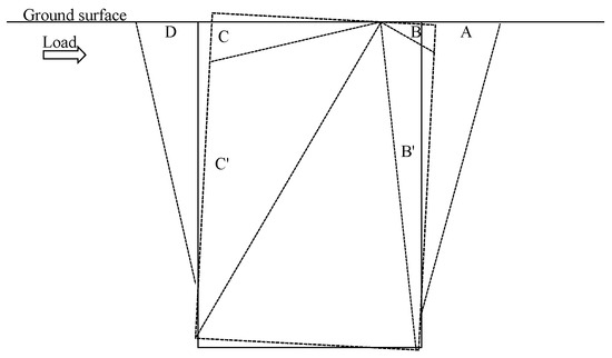 Based on the soil pressure distribution and the relative deformation of the closed wall, the interaction model between the closed wall and the soil is determined, as illustrated in Figure 10. At point A on the outer side of the front edge of the closed wall, a passive pressure zone is formed. Similarly, a passive pressure zone is formed inside point B on the front edge of the closed wall due to the deformation of the diaphragm wall. At point C on the inner side of the back edge of the closed wall, within a depth of 5 m, a passive pressure zone is formed, while an active soil pressure zone is formed at the lower part of point C’. At point D on the outer side of the back edge of the closed wall, the diaphragm wall separates from the soil, creating an active soil pressure zone.