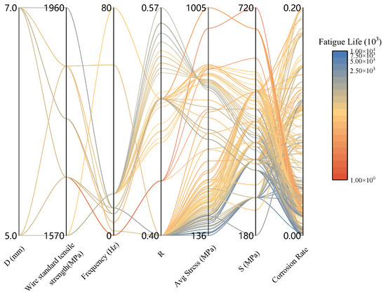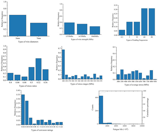 In order to enhance the dataset for machine learning purposes, we supplemented the 20 experimental datasets with an additional 466 corrosion–fatigue datasets sourced from prominent academic sources [18,19,20,21,22,23,24,25]. This resulted in a total of 486 data points, encompassing fatigue life (in cycles) along with several independent variables, including wire diameter, corrosion degree (measured by weight loss), material strength (standard tensile strength), average fatigue stress, stress range, stress ratio, and loading frequency. The distribution of each feature is shown in Figure 2, while the overall dataset is illustrated in Figure 3.
