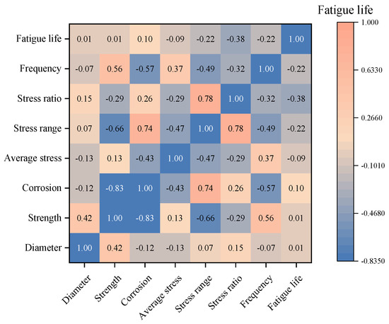 Based on this analysis, and to reduce feature redundancy while enhancing the model’s generalization performance, this study will exclude the factors of wire diameter and strength. Instead, it will focus on the four key factors: corrosion rate, average stress, stress range, stress ratio, and loading frequency. This approach is expected to effectively reduce model complexity, improve computational efficiency, and lower the risk of overfitting.