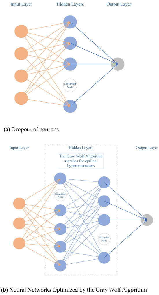 During neural network training, especially in complex models with multiple layers, the model tends to overfit the training data. Dropout is a common regularization technique that randomly drops a portion of neurons during each training iteration to reduce co-adaptation between neurons, thus improving the model’s generalization. Specifically, in each training cycle, each neuron has a certain probability of being ignored (i.e., “dropped out”), which effectively prevents the model from over-relying on the training data. Figure 6a illustrates the structure of a BP neural network with Dropout applied to its hidden layers. In this figure, the Dropout layers are inserted after each hidden layer, where certain neurons (represented by hollow circles) are randomly deactivated during each training iteration. This deactivation process forces the model to adapt without relying on specific neurons, reducing the risk of overfitting. In this study, Dropout is applied in the hidden layers of the BP neural network. By adjusting the dropout probability, we control the proportion of neurons being dropped in each layer, which reduces the complexity of the network and mitigates overfitting. As shown in Figure 6a, the network retains its original structure, but during each training cycle, different neurons are dropped out based on the predefined probability. This not only improves the model’s performance on the test set but also enhances its robustness to unseen data by preventing the network from becoming overly dependent on specific neurons.