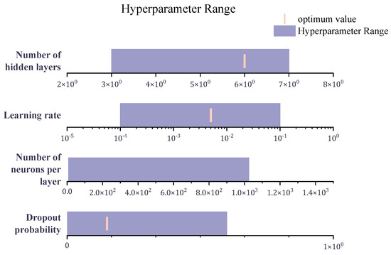 Figure 8 clearly illustrates the search range of four core hyperparameters and their corresponding optimal values obtained through optimization: the number of hidden layers, the learning rate, the number of neurons per layer, and the dropout probability.
