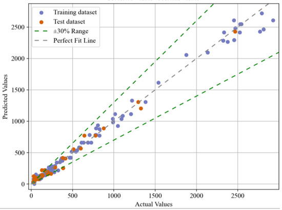 Figure 10 illustrates the relationship between predicted and actual values for both the training and test datasets. The plot includes a perfect fit line (dashed gray line) representing the ideal case where all predictions perfectly match the actual values, as well as a ±30% range (green dashed lines) to assess the acceptable margin of prediction error.
