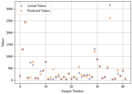 Figure 11 illustrates the comparison between actual and predicted values on the test set. The results indicate that, for most samples, the predicted values closely approximate the actual values, demonstrating high accuracy and stability in the model’s predictions. In the lower value range (approximately 0 to 500), there is a strong concordance between actual and predicted values, with minimal prediction error, suggesting an excellent model fit within this interval. However, in a limited number of cases, particularly for samples with high actual values (e.g., exceeding 1000), a noticeable discrepancy emerges between predicted and actual values. This deviation may be attributed to the scarcity of samples in this range or the intrinsic variability of the data at higher magnitudes.