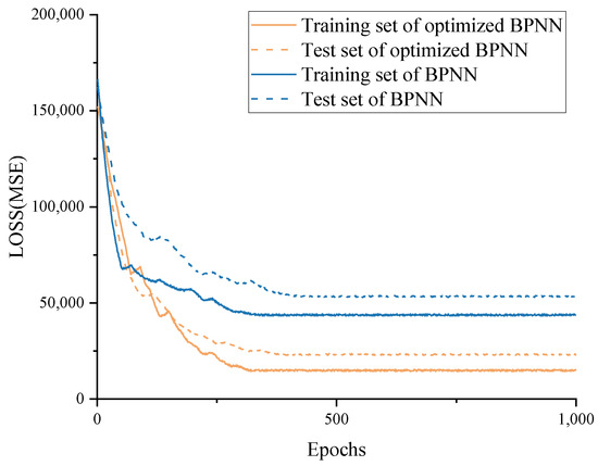 Figure 12 presents the training and test loss curves (in terms of mean squared error (MSE)) over epochs for both the optimized BPNN and the standard BPNN. As shown in the figure, both models exhibit a rapid decrease in loss during the initial training phase, indicating effective learning from the data. The optimized BPNN achieves a lower final training and test loss compared to the standard BPNN, reflecting the improved performance and enhanced generalization ability due to optimization.