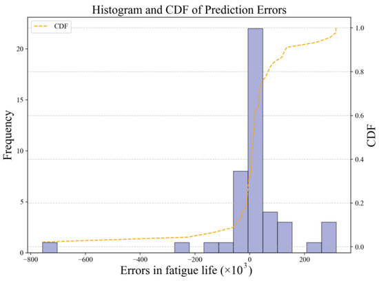 Figure 13 presents the frequency distribution and cumulative distribution function (CDF) of prediction errors in fatigue life. The histogram reveals that the majority of prediction errors are clustered around zero, indicating that the model generally achieves a high level of accuracy in predicting fatigue life. The CDF further illustrates the cumulative probability distribution of these errors, reinforcing that the model maintains low prediction errors for most samples. The error distribution shows a high frequency within the range of −200 × 103 to 200 × 103, with a concentration near zero, demonstrating the model’s robustness and stability in its predictions. However, there are a few outliers with larger errors, particularly around −800 × 103, which may be attributed to unique characteristics in certain data points or inherent data variability. These outliers suggest potential areas for further investigation or model refinement to mitigate extreme deviations. Overall, this figure indicates that the model performs well in predicting fatigue life, with errors predominantly close to zero. The cumulative distribution confirms that the majority of samples exhibit minimal prediction errors, underscoring the model’s reliability and predictive accuracy.