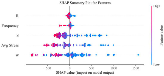 Figure 14 provides an in-depth analysis of each feature’s contribution and importance in predicting fatigue life, as captured by SHAP values. The horizontal axis displays SHAP values, representing both the direction and magnitude of each feature’s impact on model output: positive SHAP values indicate an increase in the prediction, while negative values suggest a decrease. Each point corresponds to a SHAP value for a specific prediction, with color coding reflecting the feature’s actual value (high in red, low in blue). In this figure, w exhibits the largest range of SHAP values, making it the most influential feature in predicting fatigue life. The wide variability in SHAP values for w suggests a complex, non-linear relationship with the output, where lower values of w (blue points) generally increase the predicted fatigue life, while higher values (red points) reduce it. This pattern implies that w may capture material or structural characteristics crucial to fatigue resistance, with lower values linked to conditions that enhance durability. Avg Stress also has a notable impact, though its influence is more balanced compared to w. Lower values of Avg Stress (blue points) are associated with longer predicted fatigue life, while higher values (red points) slightly reduce it. This suggests that Avg Stress interacts with other stress-related factors in the dataset, affecting fatigue life in a complex manner. The feature S shows a moderate spread of SHAP values, indicating a consistent yet less dominant effect compared to w and Avg Stress. Lower values of S (red points) are generally linked to higher SHAP values, suggesting a positive effect on fatigue life. This stable influence implies that S contributes to extended fatigue life predictions without significant non-linear interactions. In contrast, Frequency exhibits a relatively narrow range of SHAP values centered around zero, indicating minimal influence on the model’s output. Although lower values of Frequency (blue points) slightly improve predictions, its overall impact remains minor, suggesting it may play an indirect or secondary role through interactions with more impactful features. Finally, R shows the smallest range of SHAP values, reflecting its minimal effect on predictions. The clustering of R’s SHAP values around zero suggests that changes in R do not significantly alter the predicted fatigue life, as its influence is overshadowed by stronger predictors like w and Avg Stress. In summary, Figure 13 highlights w as the most influential feature, followed by Avg Stress and S, while Frequency and R have comparatively minimal impact. The broad SHAP ranges for w and Avg Stress underscore their key roles in capturing the primary factors driving fatigue life predictions, enhancing the model’s interpretability by clarifying the structural and material factors that influence fatigue life outcomes.