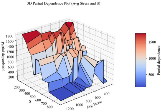 Figure 16 shows a 3D partial dependence plot depicting the combined effect of Avg Stress and S on predicted fatigue life. The vertical axis represents partial dependence, indicating how changes in Avg Stress and S jointly impact the model’s output. The plot reveals a complex, non-linear relationship, where lower values of Avg Stress and S are generally associated with higher partial dependence values, suggesting that lower stress levels contribute positively to fatigue life. As both Avg Stress and S increase, partial dependence values tend to decrease, indicating a negative influence on predicted fatigue life, likely due to the correlation of higher stress levels with accelerated material degradation. Notably, the steep decline around S = 400 likely points to dataset limitations. Sparse or uneven data distribution in this region may lead the model to misinterpret trends, resulting in abrupt changes in partial dependence. Thus, this drop may not reflect the true relationship but rather the model’s extrapolation in areas with limited data support.