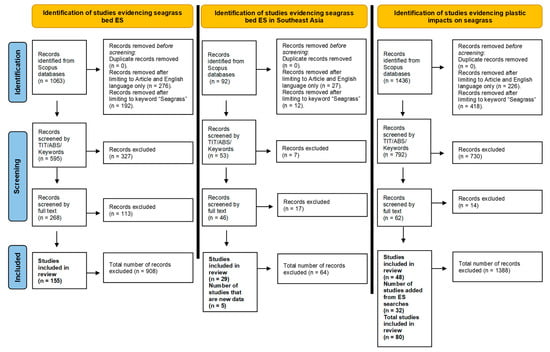The literature reviews returned 155 articles documenting the ES provided by seagrass ecosystems globally, with 29 articles relating to seagrass-derived ES in SEA; of these 29 articles, five were in addition to the initial 155. Furthermore, the literature review on the impacts of MPP returned 48 additional articles (Figure 2).