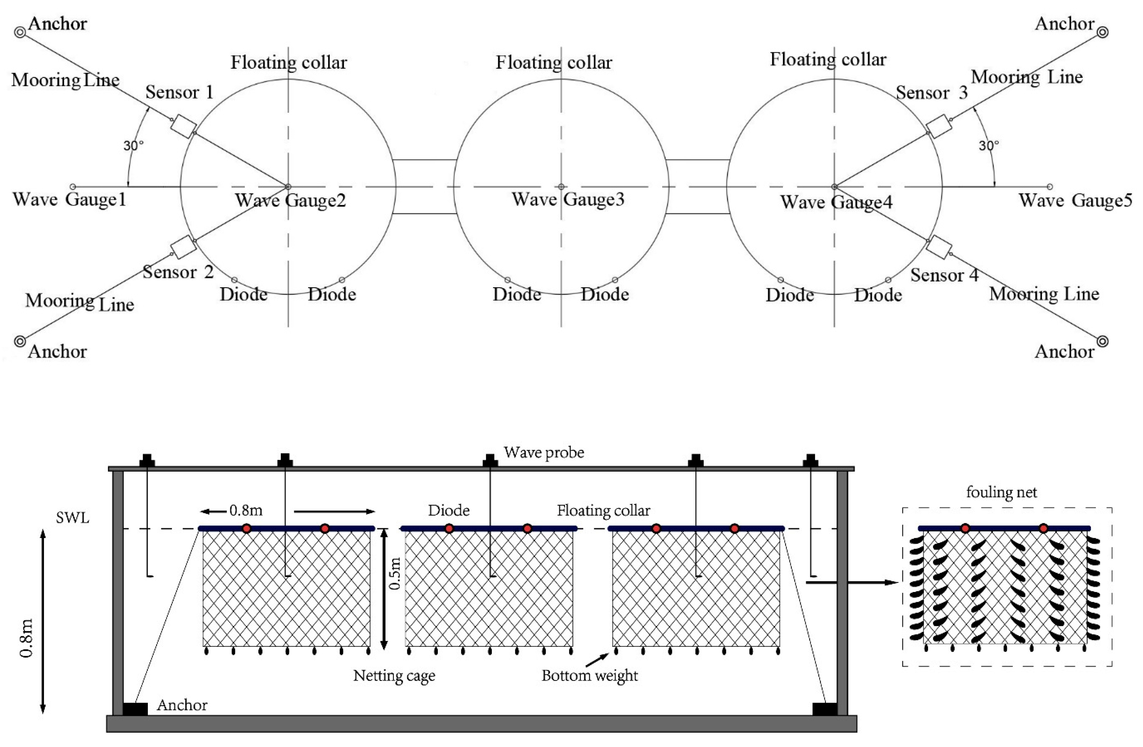 19]. Nevertheless, research concerning a biofouling aquaculture cage array remains sparse, and the nonlinear dynamic response of a biofouling aquaculture cage array is not completely understood. To resolve these issues, this paper experimentally studied the nonlinear dynamic response of a clean and biofouling aquaculture cage array in waves.