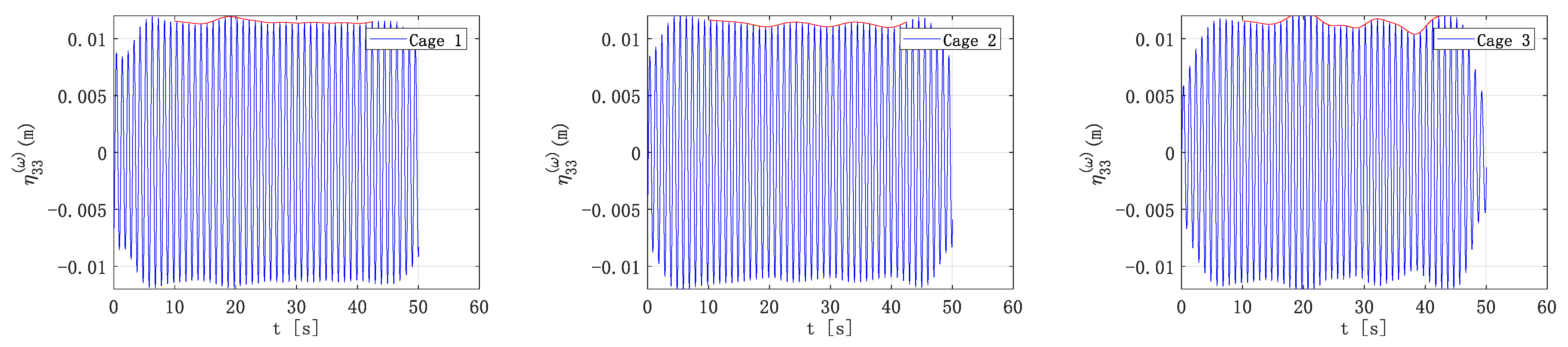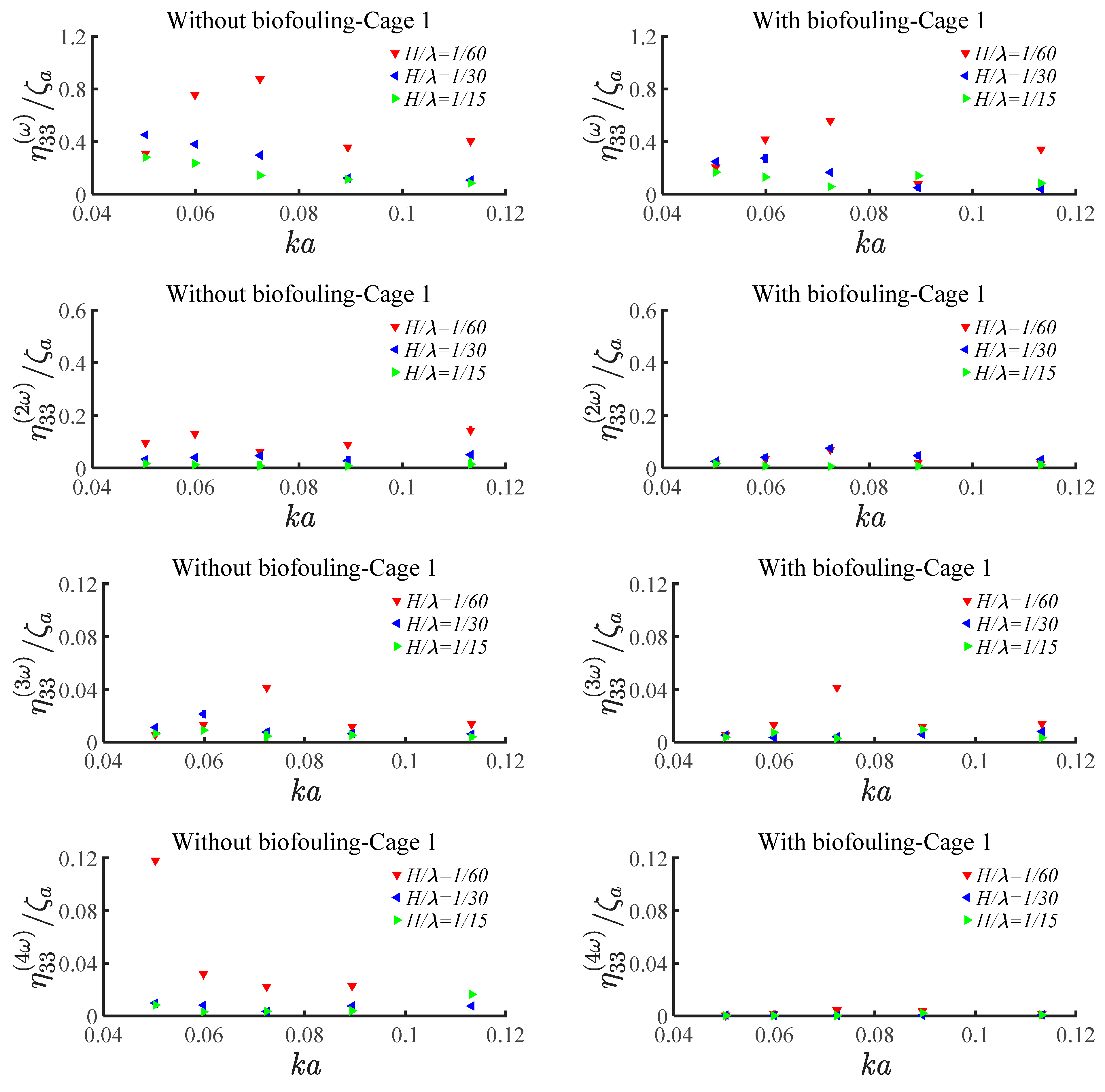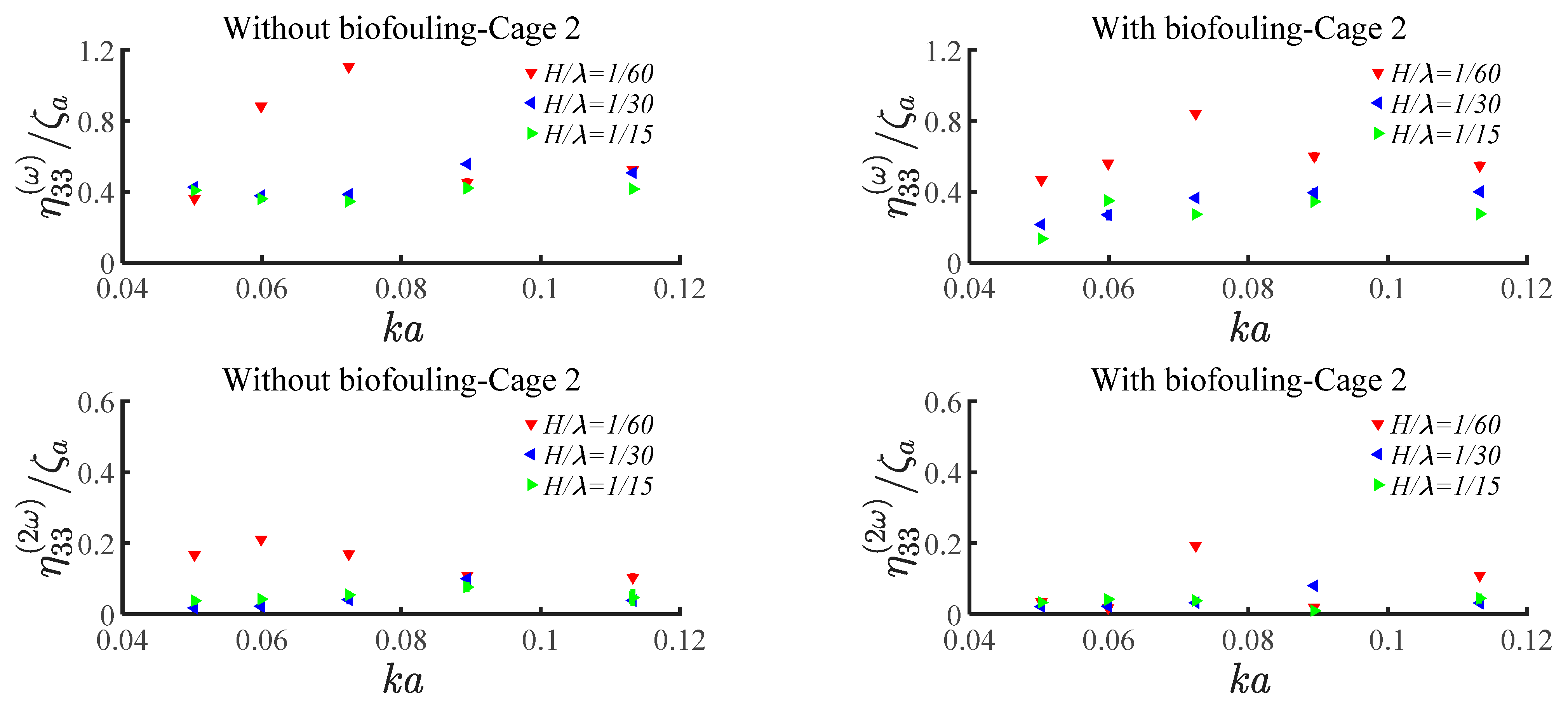 In addition, for the aquaculture cage array without biofouling, the harmonic components exhibit a decreasing trend as the wave steepness increases. For the aquaculture cage with biofouling, the predominant trend remains aligned with that of the aquaculture cage array without biofouling. More specifically, it is evident that the harmonic components also tend to decrease in response to the increasing wave steepness. It has also been observed that the biofouling may not significantly influence the nonlinearity of the heave motion, since the higher-order harmonic components of the heave can be negligible, and this is largely attributed to the additional damping effects.