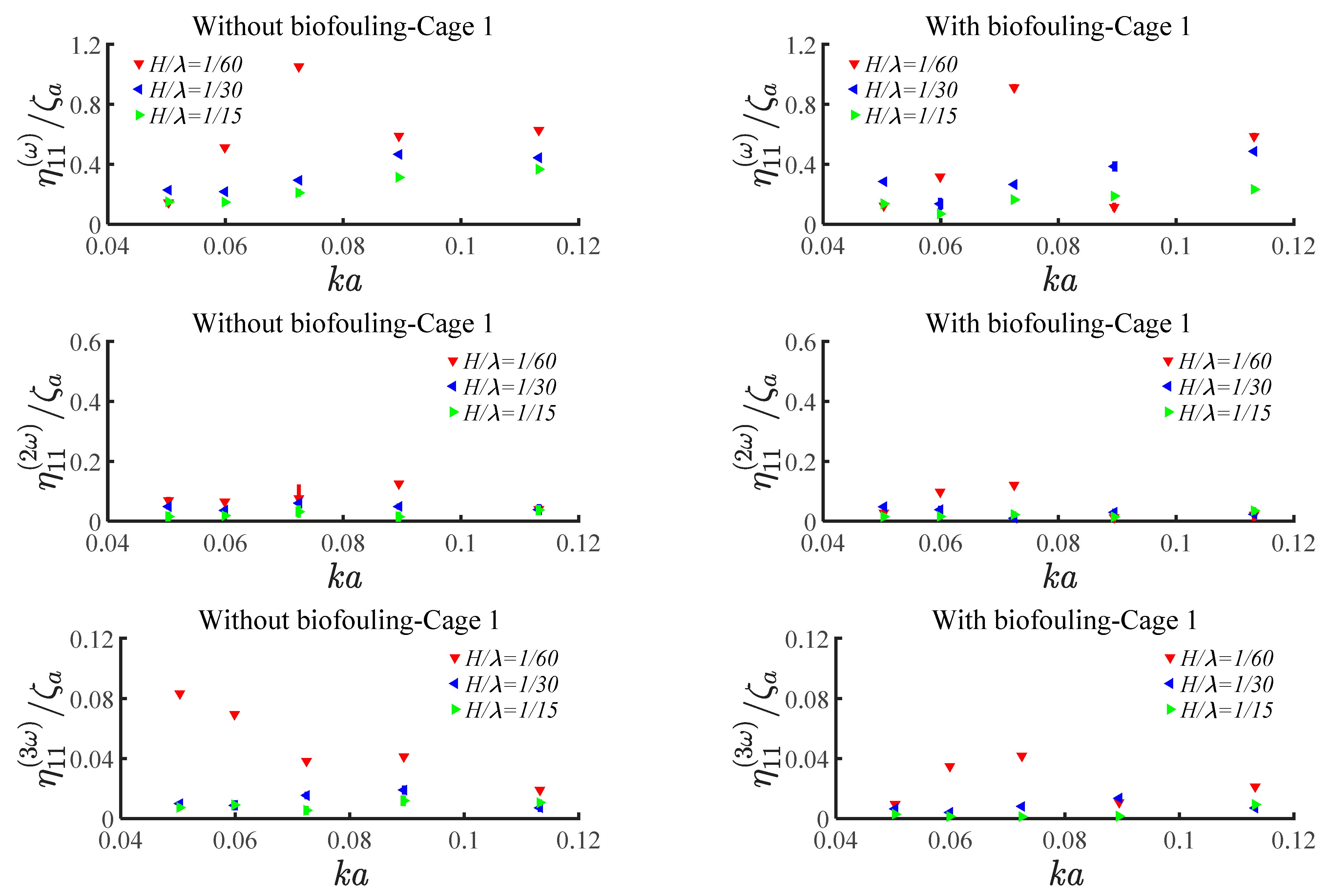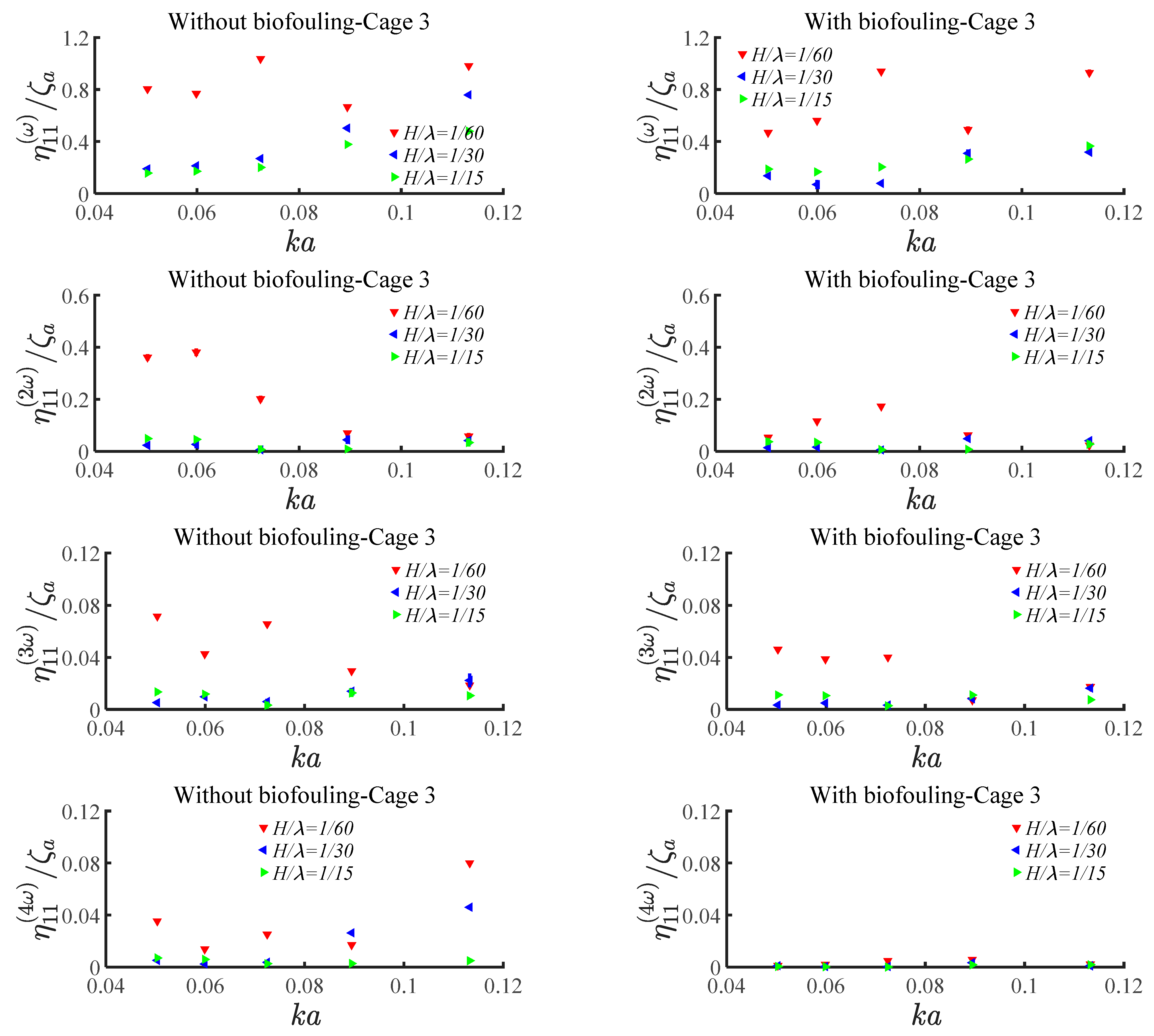 Additionally, it has been observed that the harmonic components exhibit a decreasing trend as the wave steepness increases. This relationship highlights the intricate dynamics between waves and their harmonic components, suggesting that as the wave becomes less steep, the presence and intensity of higher harmonics tend to increase correspondingly. For the aquaculture cage array without biofouling, the peak of the non-dimensional harmonics is recorded at a wave steepness of 1/60, spanning from the first to the fourth orders. Although a definitive trend has not been established for the aquaculture cage with biofouling, the predominant trend remains consistent with that of the aquaculture cage array without biofouling. Specifically, the harmonic components tend to decrease as the wave steepness increases. Nevertheless, it is imperative to consider the species of different marine organisms that may influence these dynamics. These variables could affect the interactions between waves and the harmonic responses observed in biofouling and non-biofouling conditions.