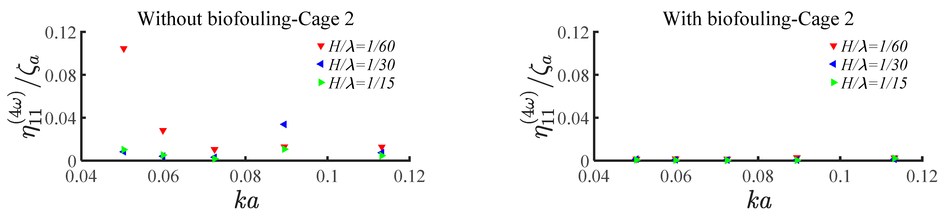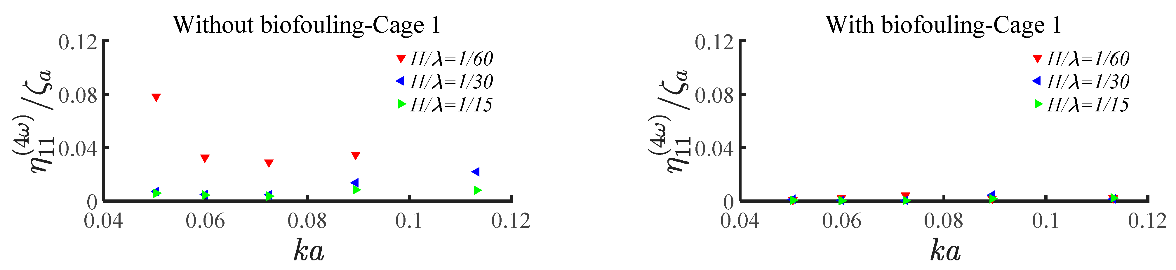 regarding aquaculture cage with and without biofouling. In contrast, the other higher-order components do not exhibit a consistent trend; however, they still contribute significantly to the nonlinear surge motion. These higher-order components enhance the nonlinearity of the surge motion, thereby influencing the overall dynamics of the system. By identifying the conditions under which harmonic components are maximized, engineers could enhance the resilience of aquaculture cage systems against wave-induced excitations.