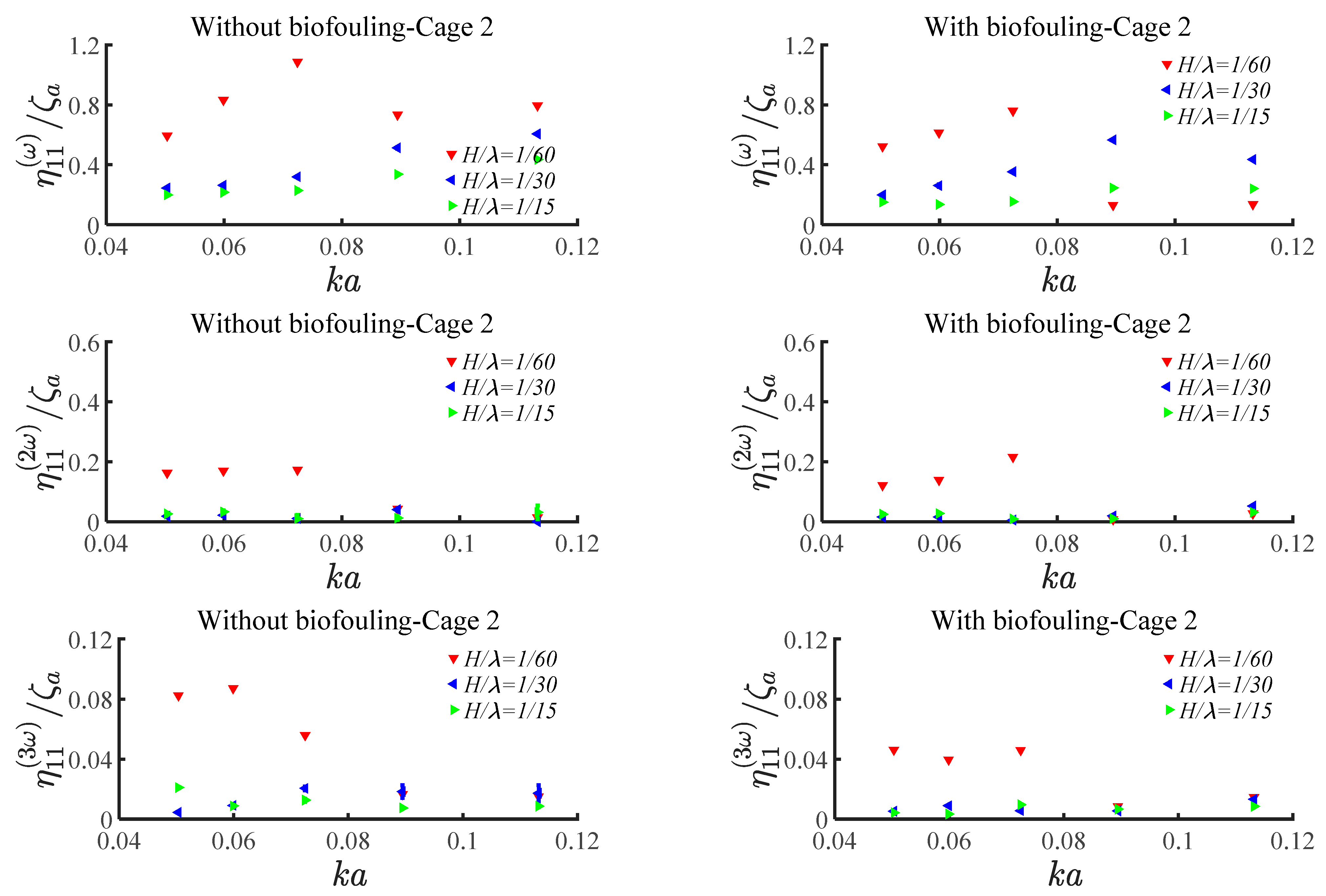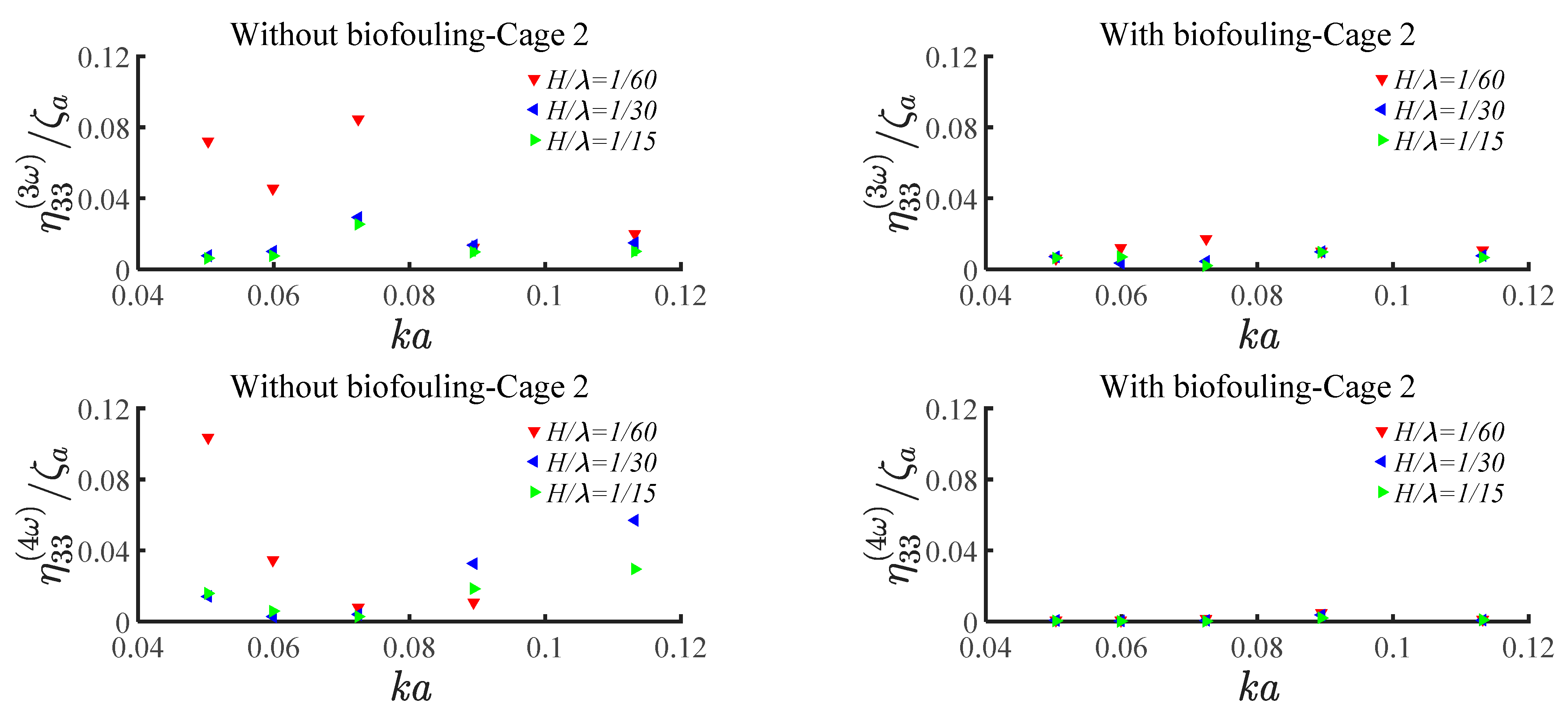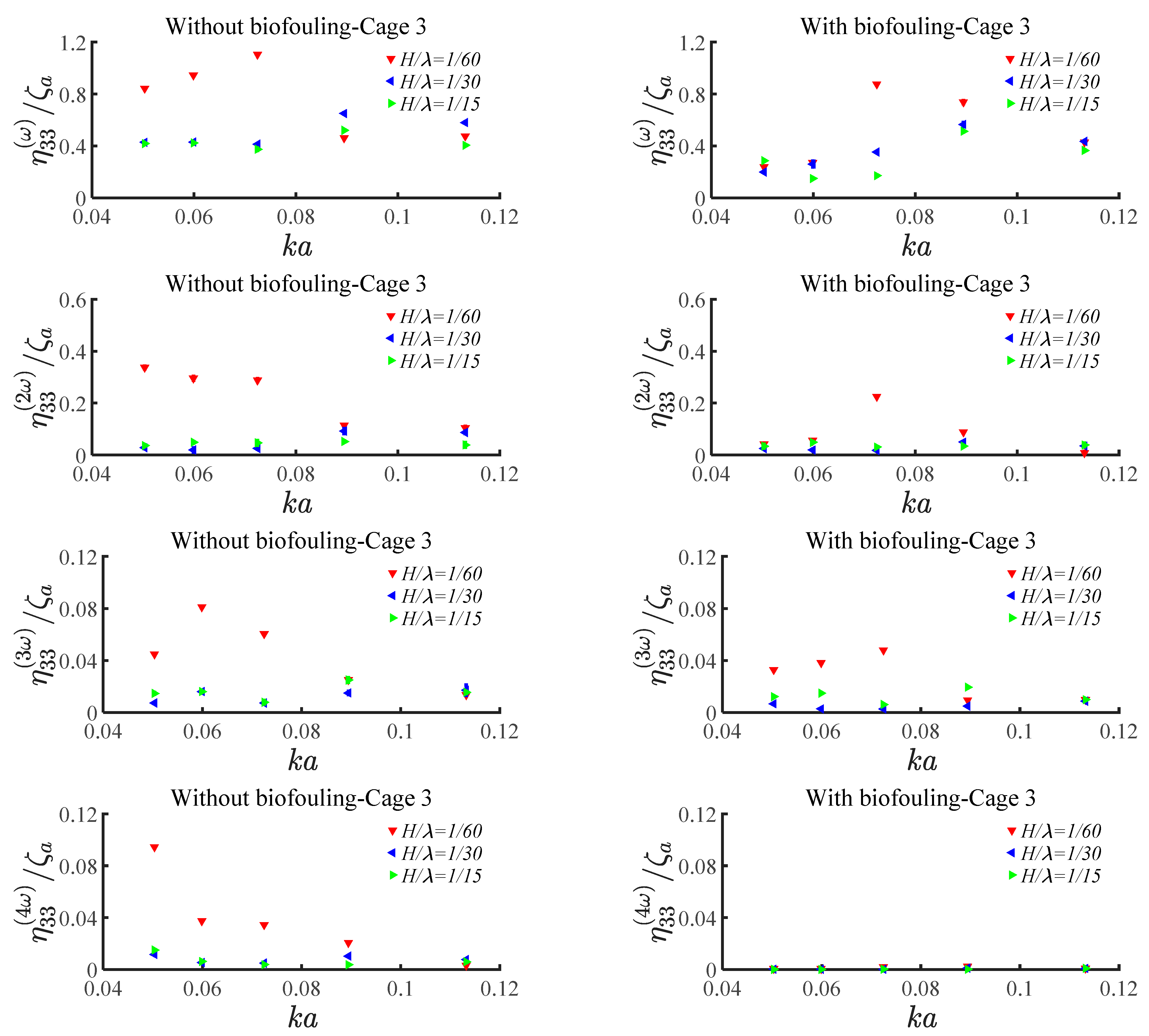 at wave steepness of 1/60, 1/30 and 1/15 for cage 2 with and without biofouling. Similarly to cage 1, as the higher-order components increase, the corresponding values exhibit a decreased trend in magnitude. A significant inflection point is identified at the non-dimensional wave number