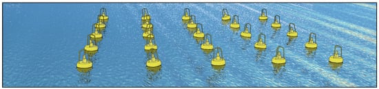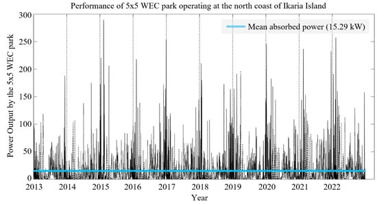 We consider a WEC park consisting of twenty-five (25) devices, placed in a 5 × 5 arrangement, see Figure 4, operating at the north coast of the island of Ikaria, located in the Eastern Aegean Sea region, where the wave energy potential is relatively increased [].
