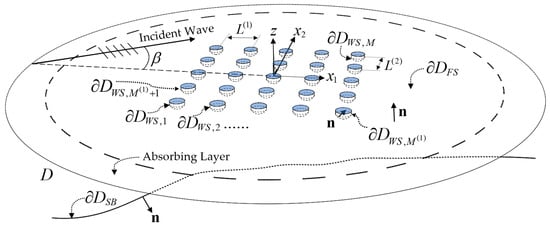 Boundary value problems (BVPs), with the Laplace equation for the potential functions being the field equation, supplemented by suitable boundary conditions (BCs) at the different sections that make up the boundary of the domain, are numerically solved to evaluate the diffraction and radiation fields. The latter boundary, as illustrated in Figure 2, comprises the water-free surface () the wetted surface of each device (, m = 1, 2,…, M) and the solid boundary of the seabed (). The mixed free surface boundary condition (FSBC) is used on and no-entrance BCs are used on the solid boundaries, resulting in the following BVPs,