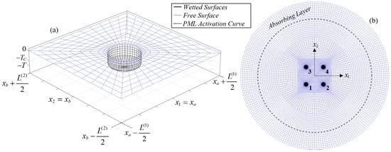 The mesh is generated by combining matching structured meshes of the distinct boundary surfaces, ensuring continuous junctions between the different segments which, in conjunction with the 4-node panels, result in global continuity of the discretized boundary. More specifically, the mesh of the WEC’s wetted surface consists of a part that models the lateral surface of the submerged volume’s cylindrical part, supplemented by a mesh of the oblate semi-spheroidal part, defined in spherical coordinates. Furthermore, the free surface in the vicinity of each WEC is modeled by a rectangular block of dimensions and , in the and -directions, respectively, centered at the WEC waterplane’s midpoint. The block is discretized by a radial mesh, using gradually increasing resolution while approaching the wetted surface, for obtaining better quality results. An indicative boundary mesh of a WEC, along with the corresponding free surface block mesh, is illustrated in Figure 3a. The computational mesh shown in Figure 3a is replicated M times to produce the mesh of the whole WEC park, as depicted in Figure 3b (for the case ). Subsequently, a radial mesh is constructed around the WEC park, modeling the remainder of the free surface boundary, extending to a certain number of mean wavelengths and thus, the total radius of the mesh as well as the activation radius of the PML are frequency dependent. It is noted that the nodes distributed in the azimuthal direction are doubled at a specific radius, as shown in Figure 3b, in order to maintain a predefined minimum of elements per wavelength (15–20) in both the angular and radial directions, at the outer part of the free surface mesh. The , coordinates of the seabed mesh in the area of the park are defined by a simple rectangular mesh, while the rest of the seabed boundary mesh is defined similarly to that of the free surface. The -coordinate can be used to model any arbitrary seabed topography.