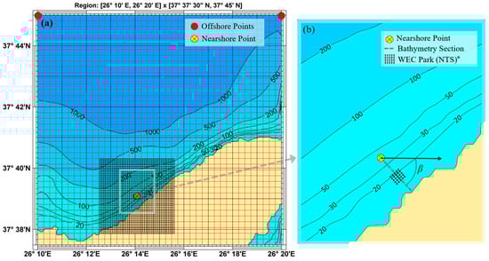 The wave climatology in the region is derived by a 10-year-long time series, which is obtained from the ERA5 database [] and covers the period between the years 2013 and 2022, at the offshore points 37°45′ N, 26°10′ E and 37°45′ N, 26°20′ E (see Figure 4a). The significant wave height () and the mean energy wave period () are included in the available dataset, along with mean wave direction (—measured clockwise with zero at North), with a resolution in time. Nearshore wave parameters at the target point 37°39′05″N, 26°14′05″E, are obtained by an offshore-to-nearshore (OtN) transformation. The local depth at the target point is 40 m, (see Figure 4), which is also taken to be the maximum depth of the BEM-CMS model () at the region of incidence (see Equation (16)). The OtN is performed using the SWAN model, see []. Offshore conditions defined by the parameters ), are considered known, across the seaward boundary and are used to reconstruct directional spectra utilizing the JONSWAP spectrum, along with a hyperbolic type spreading function; (see Section 3.4.4 of Ref. []).