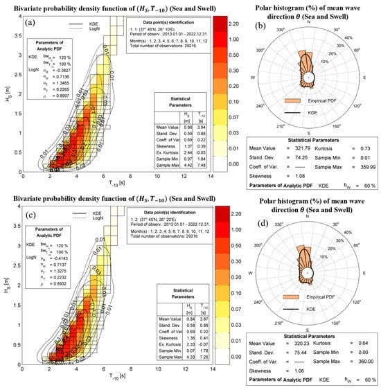 Wave climatology at the offshore points (a,b) 37°45′ N, 26°10′ E and (c,d) 37°45′ N, 26°20′ E. (a,c) statistics and (b,d) corresponding polar histograms.
