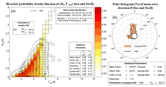 Equation (17) expresses action balance, with representing the wave action density, defined in terms of spectral density and frequency . The components denote propagation velocity in the physical space, while denote corresponding components in the Fourier space. Moreover, represents the source terms which include, among others, wind-generated wave growth, wave breaking-induced dissipation in deep and shallow water and bottom friction. The OtN transformation is discussed in more detail in Ref. []. Offshore wave climatology at the two offshore points, is presented in Figure 5, where the distributions are represented by standard lognormal and KDE models. The corresponding nearshore climatology is shown in Figure 6.