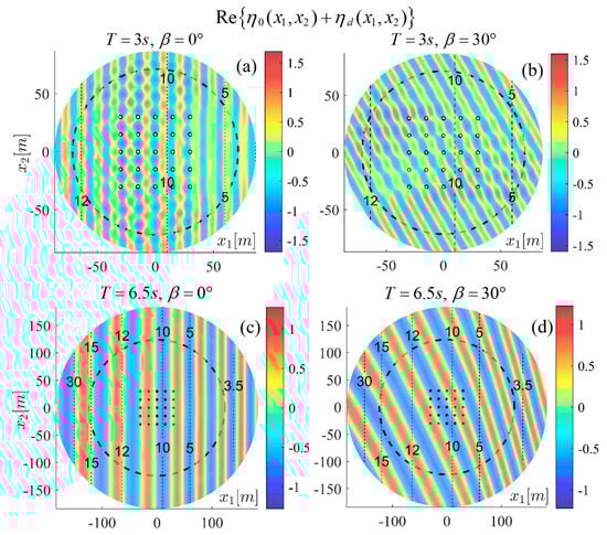 Figure 7 illustrates the real part of the propagating field (comprising the incident and the diffracted subfields), for the array of 25 WECs of radius , with total draft and , placed in a 5 × 5 arrangement with . The origin of the coordinate system of the BEM–CMS model is located 190 m away from the coastline and the local depth at is . All results hereafter refer to the above setup.