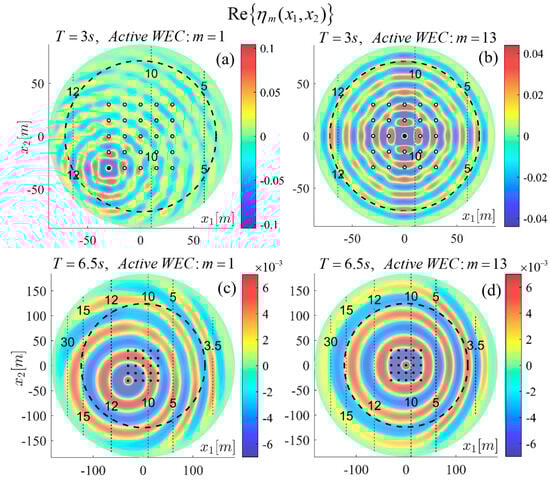 The color plots in Figure 7 illustrate the potential on the free surface, multiplied by so that it represents the free surface elevation . Figure 8 shows the real part of the free surface elevation corresponding to indicative radiation fields by the WECs 1 and 13. It can be observed that for low frequencies (see Figure 7c,d and Figure 8c,d), the interaction of the fields with the variable bathymetry becomes significant, while for higher frequencies (see Figure 7a,b and Figure 8a,b) the floating devices pose a more considerable effect on both the propagating and the radiated fields. The scattering in the downwave direction, which results in partial shadowing of waves at the lee side, is also observable in Figure 7a,b. Furthermore, the relevant reduction in the local wavelength can be seen in Figure 7c, which is triggered by the decrease in phase velocity due to an interaction of the field with the shoaling bathymetry. In the field shown in Figure 7d, the decrease in phase velocity also results in refraction, due to oblique wave incidence, and it can be observed that the wavefronts tend to align with the isobath lines.